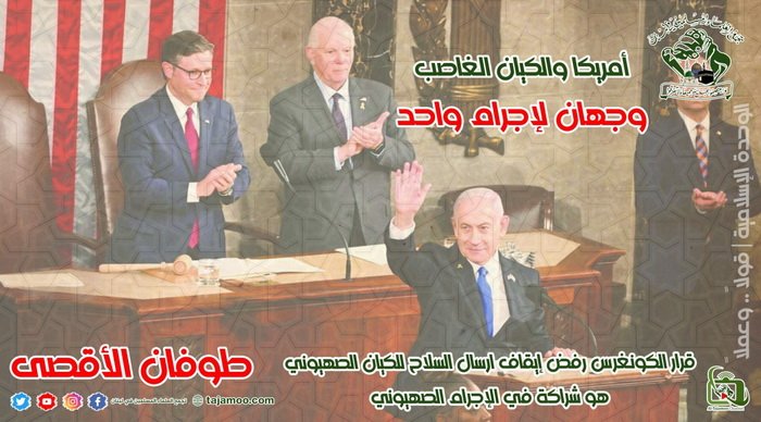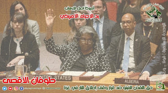 ثانياً: يستنكر تجمع العلماء المسلمين قيام راعية الإرهاب العالمي الشيطان الأكبر الولايات المتحدة الأمريكية باتخاذ قرار النقض الفيتو بمواجهة قرار أجمعت عليه الدول الموجودة في مجلس الأمن لوقف إطلاق النار كما يستنكر قرار الكونغرس في رفض اقتراح إيقاف المساعدات العسكرية للكيان الصهيوني ما يؤكد أن هذه الدولة الظالمة هي شريكة فعلية بعملية الإبادة الجماعية للشعب الفلسطيني.