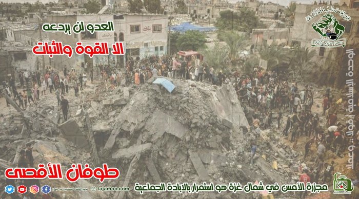 أولاً: يستنكر تجمع العلماء المسلمين المجازر التي ارتكبها العدو الصهيوني مساء أمس في شمال غزة والتي أدت إلى إيقاع العشرات من الشهداء والمئات في الجرحى وسط حصار من قبل العدو بمنع فرق الدفاع المدني من إنقاذ العالقين تحت الأنقاض وسيارات الإسعاف من الوصول إلى الجرحى لنقلهم إلى المستشفى الوحيد الذي لا يملك الإمكانات اللوجستية لإسعافهم ما يؤكد أن العدو الصهيوني يستمر في ارتكابه للإبادة الجماعية بحق الشعب الفلسطيني.