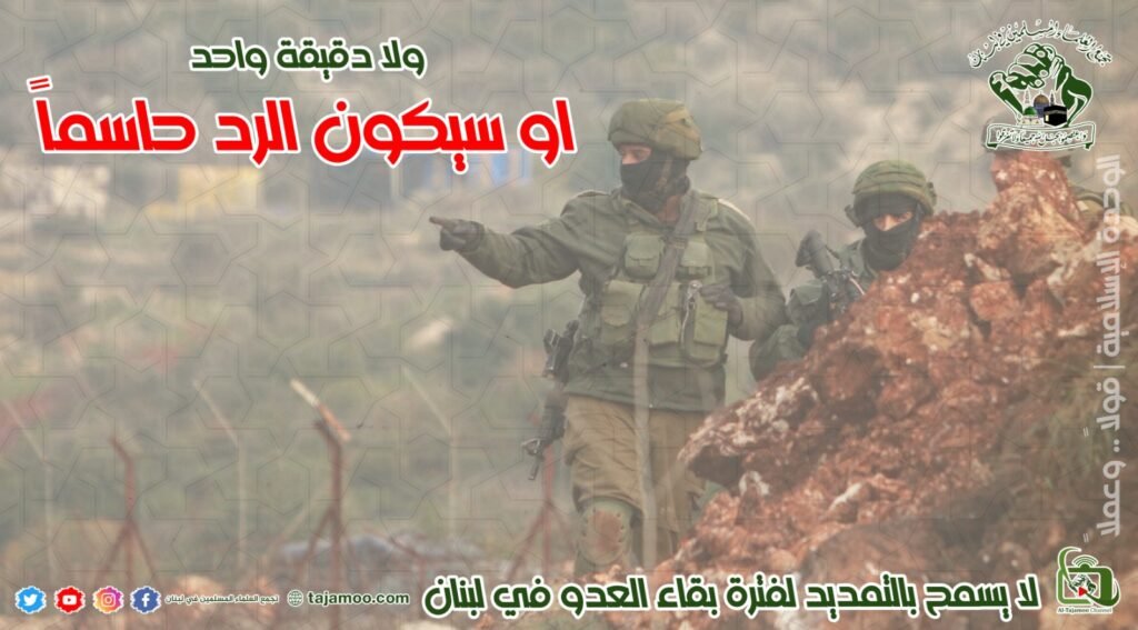 رابعاً: سمعنا عبر تقرير الناطق باسم جيش الاحتلال الصهيوني أفيخاي أدرعي أن العدو الصهيوني قرر تمديد فترة بقائه في المناطق التي يحتلها في الجنوب اللبناني إلى الأول من آذار، ويعتبر التجمع أن على الحكومة أن ترفض هذا الأمر، وتعلن للدول الراعية للاتفاق أن هذا الأمر إن حصل فهو يعني أن للبنان الحق بالدفاع عن نفسه بكل ما أوتي من قوة ومقدرات، ومنها المقاومة وليتحمل مسؤولية ذلك.
