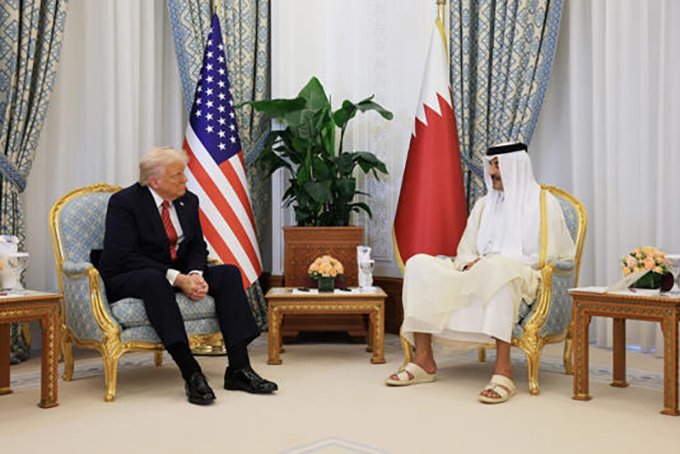 استقبل أمير قطر الشيخ تميم بن حمد آل ثاني، الرئيس الأمريكي دونالد ترامب، يوم الأربعاء 14مايو 2025، في الدوحة ثانية محطات جولته الخليجية التي بدأها أمس الأول الثلاثاء من الرياض، ويختتمها اليوم الخميس في الإمارات. وعقد ترامب والشيخ تميم بن حمد آل ثاني، جلسة مشاورات مغلقة استمرت لنحو ساعتين شهدا في أعقابها توقيع عدد من الاتفاقيات. وقال أمير قطر خلال استقباله الرئيس الأمريكي، في الديوان الأميري: “جميعنا يريد إحلال السلام في المنطقة ونأمل أن يتحقق ذلك هذه المرة. أعلم أنك رجل سلام وتريد إحلال السلام في المنطقة”.