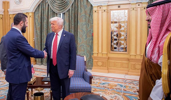 من جهته، شكر الشرع بن سلمان على جهوده في رفع العقوبات عن سوريا، وقال إنّ “قرار ترامب رفع العقوبات عن سوريا سيُسهم في تحقيق الأمن والاستقرار وسيفتح صفحة جديدة لإعادة بناء البلاد”. وأكَّد الشرع على ضرورة انسحاب إيران من سوريا، داعياً الشركات الأمريكية للاستثمار في النفط والغاز بسوريا.