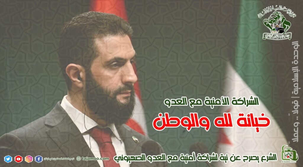 رابعاً: يستنكر تجمع العلماء المسلمين ما أعلن عن أن الرئيس السوري أحمد الشرع قد أبدى انفتاحاً على قيام شراكة أمنية مع العدو الصهيوني، في ظل ما وصفه بوجود أعداء مشتركين، مؤكداً رغبة بلاده في بناء نموذج جديد للأمن القومي يستند الى المصالح المتبادلة، ما يؤكد انحراف هذا الرجل باتجاه إخراج سوريا من محور المواجهة مع العدو الصهيوني، والتسليم للعدو الصهيوني باحتلاله لفلسطين ولأقسام من سوريا والاستسلام لرغباته وللإملاءات الأمريكية.