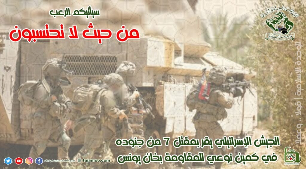 أولاً: يتوجه تجمع العلماء المسلمين بالتحية لأبطال المقاومة في فلسطين على الكمين المحكم والناجح في خان يونس والذي أوقع سبعة قتلى من الجنود الصهاينة وإصابة آخرين بجراح بعضها حرجة، ويعتبر ان هذه العملية دليل على ان المقاومة باقية وهي بكامل جهوزيتها لإيقاع الخسائر الكبرى في صفوف العدو الصهيوني الذي لا ملجأ له سوى الاقرار بالهزيمة والموافقة على وقفٍ نهائي لإطلاق النار، والمشاركة بمفاوضات غير مباشرة مع حركة حماس لإطلاق الاسرى من الجانبين.