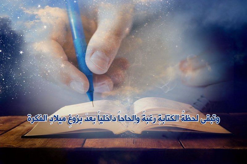وتبقى لحظةُ الكتابةِ رغبةً وإلحاحاً داخلياً بعدَ بزوغِ ميلادِ الفكرة، هنا تُفرِدُ مساحةَ الوقتِ والزمانِ للتقييدِ، ومَثَلُ الكلماتِ والأفكارِ كالطيورِ تتفلّت تطايراً. وتقيدها كتابتها لتُحفَظ مخافة النسيان.