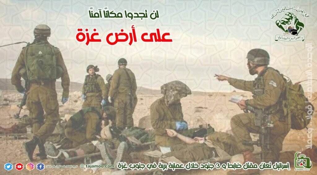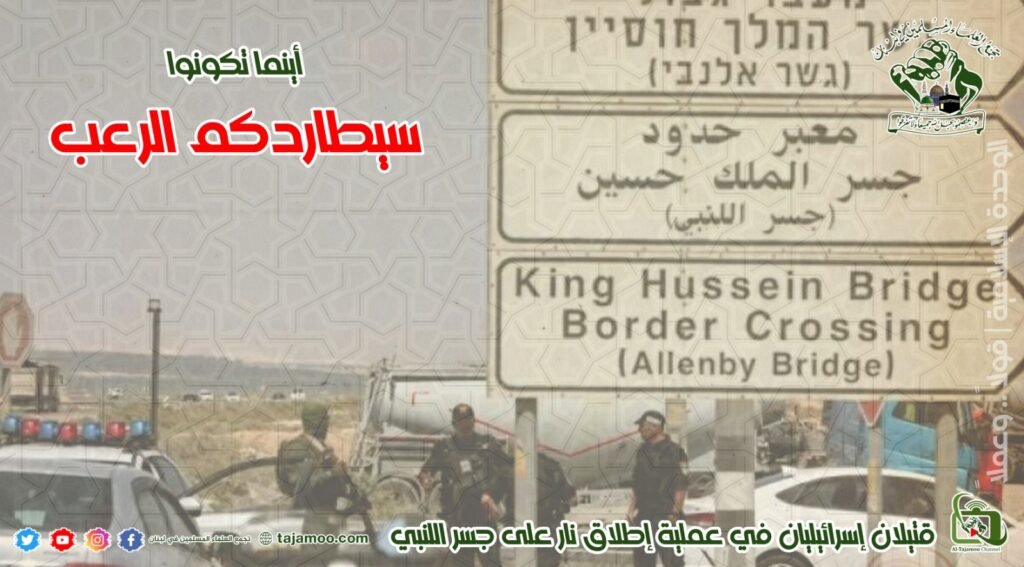 رابعاً: يتوجه تجمع العلماء المسلمين بالتحية للعملية البطولية التي نفذتها المقاومة عند معبر اللنبي، ما أدى لمقتل مقدّم احتياط في الجيش الصهيوني ورقيب في لواء “تفيل”، وهذا ما يؤكد ان الأمة في كل بلدانها تتحين الفرص للإيقاع بالعدو الصهيوني، ولا تنفع المعاهدات التي عقدها الكيان الصهيوني مع الأردن في وادي عربة في منع الأبطال النشامى من خوضهم لمعركة الأمة في مواجهة الاحتلال الصهيوني.