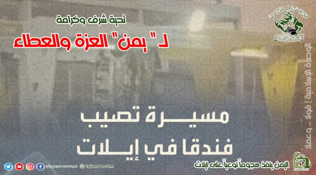 خامساً: يتوجه تجمع العلماء المسلمين بالتحية للقوات المسلحة اليمنية على هجومها الناجح بصاروخ باليستي على يافا، وثلاث مسيرات على أم الرشراش، ومسيرة على بئر السبع، ما أدى وبحسب الإعلام الصهيوني إلى إصابة مسيرة يمنية لفندق “نافيه” في “إيلات” المحتلة، وإغلاق مطار “رامون”، فضلاً عن انقطاع التيار الكهربائي في المنطقة.