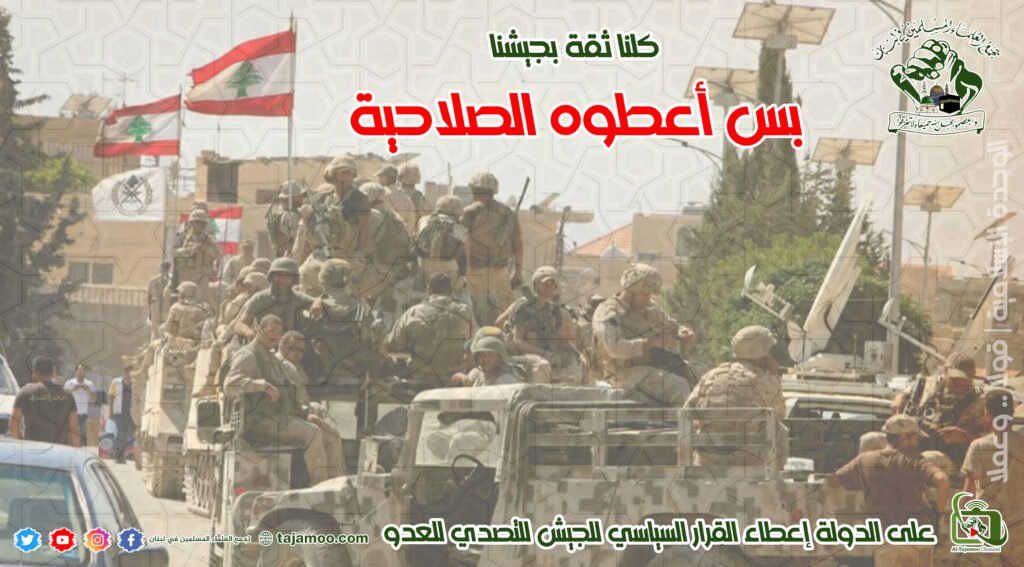 ثالثاً: يعتبر تجمع العلماء المسلمين أن التعامل مع هكذا خروقات يحتاج إلى قرار جريء من الدولة اللبنانية، يقتضي إعطاء القرار السياسي للجيش اللبناني للتصدي العسكري لكل محاولات التقدم للعدو الصهيوني، وبذلك يرتدع عن التمادي في خروقاته، ولا حل آخر أمامنا وسط إهمال وإغفال واضحَيْن من قبل الولايات المتحدة الأمريكية والقوى الضامنة للقرار 1701 وقرار وقف إطلاق النار.
