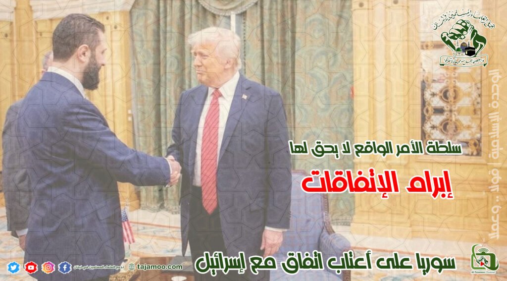 رابعاً: يعتبر تجمع العلماء المسلمين أنه ليس من حق سلطة الأمر الواقع في سوريا القيام بمحادثات مع العدو الصهيوني مقدمة لإقامة علاقات معه والتنازل عن أراضٍ سورية لصالحه، خصوصاً وأن هذه السلطة لا تتمتع بالشرعية الدستورية، وأنه لا بد في البداية من استفتاء الشعب السوري على نوع الحكم الذي يريده، ثم إعداد دستور جديد للبلاد وانتخابات حرة ونزيهة تنتج سلطة تمتلك الحق في اتخاذ قرارات مصيرية بهذا المستوى.