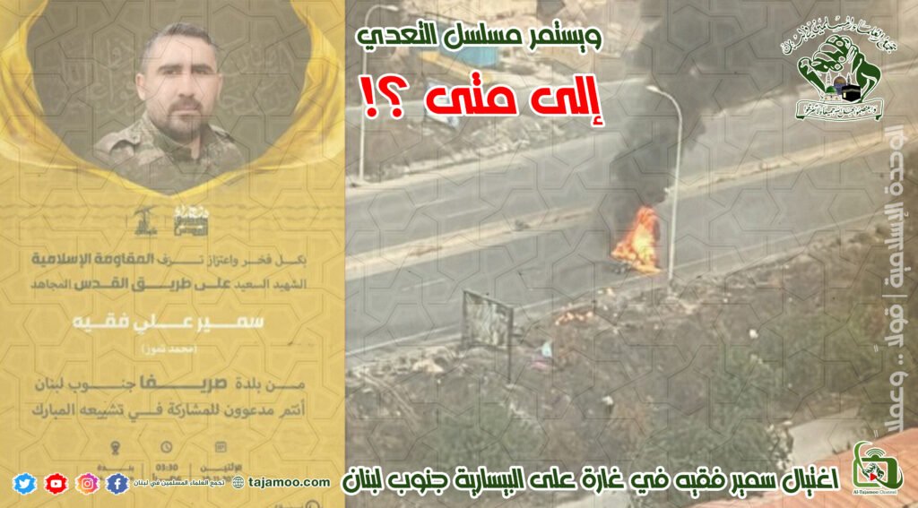 ثانياً: يستنكر تجمع العلماء المسلمين إقدام العدو الصهيوني على الإغارة على سيارة في بلدة البيسارية، ما أدى إلى ارتقاء الشهيد القائد سمير فقيه مسؤول جمعية خدام الإمام الحسين عليه السلام، كما ويحيي التجمع الشهيدين محمد وحسن كنعان من السرايا اللبنانية لمقاومة الاحتلال الصهيوني على الشهادة التي أكرمهما الله بها على طريق القدس. كما ويستنكر تجمع العلماء المسلمين إقدام العدو الصهيوني على تفجير ثلاثة منازل في بلدة حولا عند الساعات الاولى من بعد منتصف الليل.