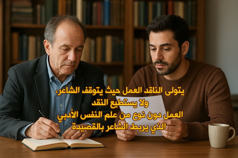يتولى الناقد العمل حيث يتوقف الشاعر، ولا يستطيع النقد العمل دون نوع من علم النفس الأدبي الذي يربط الشاعر بالقصيدة. وقد يكون جزءاً من ذلك العلم دراسة نفسية الشاعر مع أن هذه الدراسة مفيدة بشكل رئيسي في تحليل الاخفاقات في تعبيره. فالعقل وحده دون الغريزة الفنية لا يمكن أن يوّلد شاعراً كبيراً، ولا عبقرياً عظيماً في مجال الشعر، بل والفنون، والحديث شجون، ولله في خلقه شؤون!.