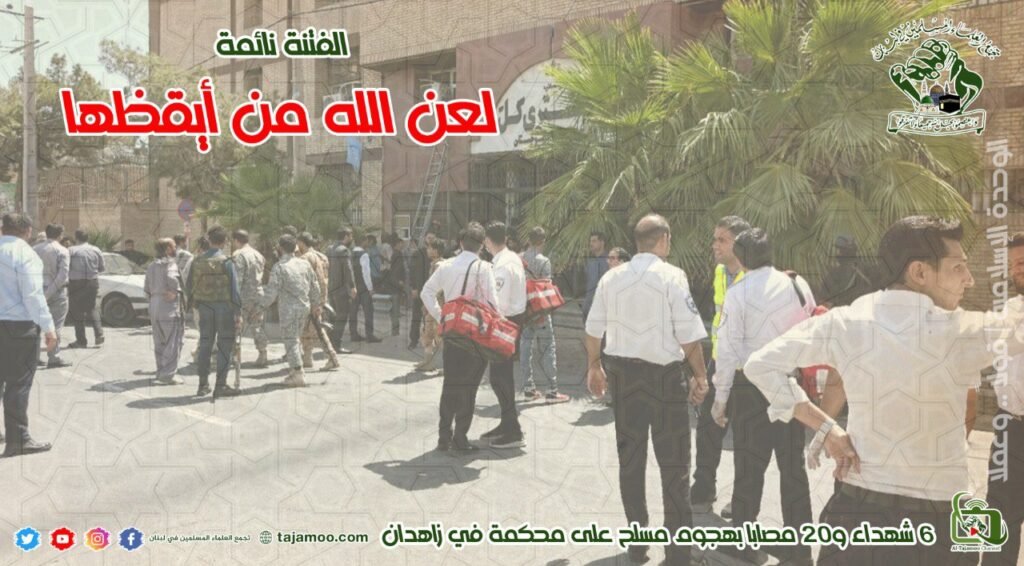 رابعاً: يستنكر تجمع العلماء المسلمين قيام مجموعات تكفيرية إرهابية بالهجوم على مبنى النيابة العامة في مدينة زاهدان بمحافظة سيستان وبلوشستان، معتبرين هذا العمل التخريبي يأتي في سياق إطلاق فتنة مذهبية في هذه البلاد الآمنة التي نعرف أن أهلها يؤمنون بالوحدة الإسلامية ويدينون بالولاء للجمهورية الإسلامية الإيرانية.