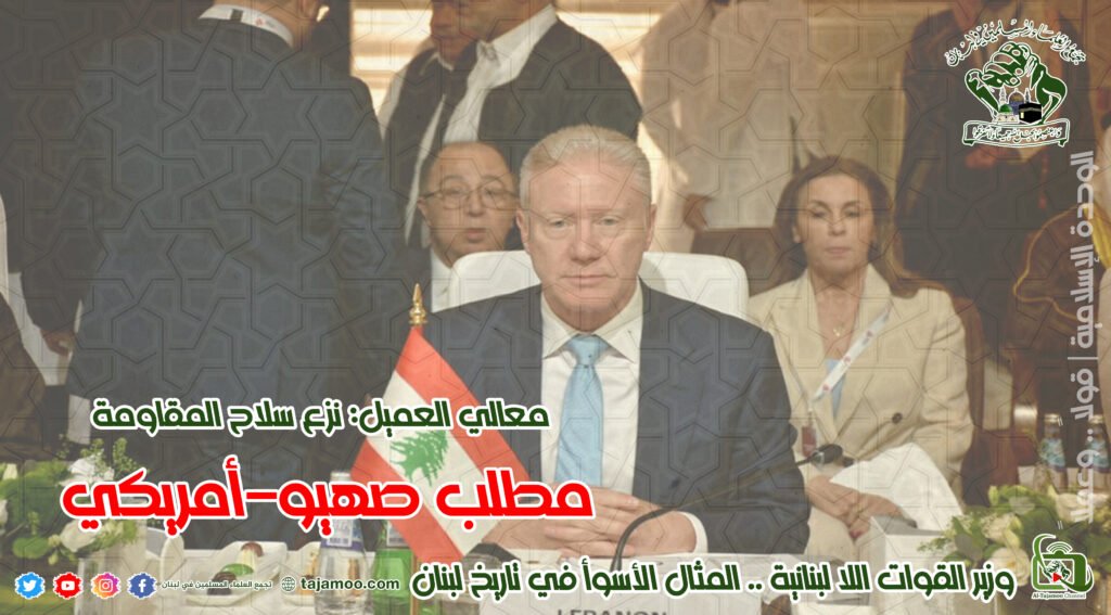 رابعاً: نطالب الحكومة اللبنانية بموقف واضح من الاعتداءات الصهيونية وإيقاف كل إجراءات خطة حصرية السلاح، حتى يلتزم الكيان الصهيوني بالانسحاب من المناطق التي يحتلها في الجنوب، وإعادة كل الأسرى ووقف الاغتيالات والقصف الجوي للقرى والمنازل، وانتهاك الأجواء اللبنانية، وانطلاق عجلة إعادة الإعمار، وبعد ذلك ندعو لمؤتمر وطني يترأسه فخامة رئيس الجمهورية العماد جوزاف عون للبحث في استراتيجية وطنية للدفاع، وبغير ذلك تكون الحكومة مذعنة للإملاءات الأمريكية.