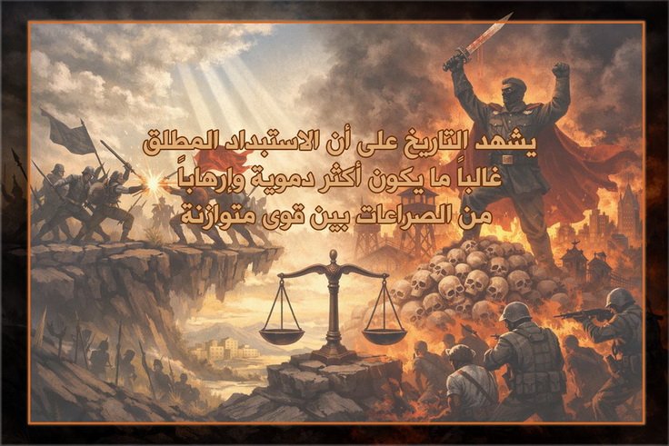 ويشهد التاريخ على أن الاستبداد المطلق غالباً ما يكون أكثر دموية وإرهاباً من الصراعات بين قوى متوازنة. فالدكتاتوريات الشمولية في القرن العشرين (النازية، الستالينية، وغيرها) تسببت في حدوث كثير من المآسي للبشرية، لأنها قمعت كل أشكال المعارضة ومواقع التنافس.. بينما في الأنظمة التعددية، حتى عندما تشهد صراعات عنيفة، تبقى هناك حدود لهذا العنف بسبب وجود قوى متوازنة تضعف من قدرة أي طرف على التمادي في القمع.