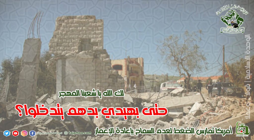 ثانياً: يستنكر تجمع العلماء المسلمين الضغط الذي تمارسه الولايات المتحدة الأمريكية على الحكومة اللبنانية والحكومات الصديقة لمنع إعادة إعمار ما هدمه العدو الصهيوني، خصوصاً ما تبين من خلال تراجع دولة قطر عن تمويل إعادة إعمار ثلاث بلدات هدمتها آلة الدمار الصهيونية.