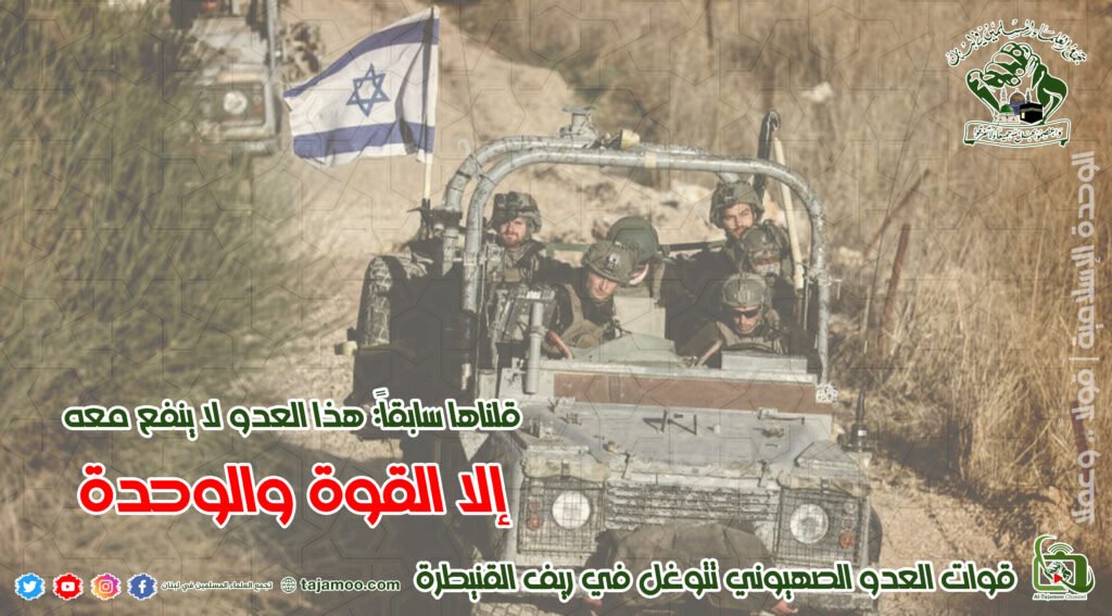 رابعاً: يستنكر تجمع العلماء المسلمين استمرار العدو الصهيوني بالاعتداء على السيادة السورية، والتي كان آخرها التوغل الصهيوني في ريف القنيطرة الجنوبي، وإقامتها حواجز عسكرية وتفتيش المواطنين دون أي تحرك من سلطة الأمر الواقع في مواجهة هذه الانتهاكات للسيادة الوطنية.