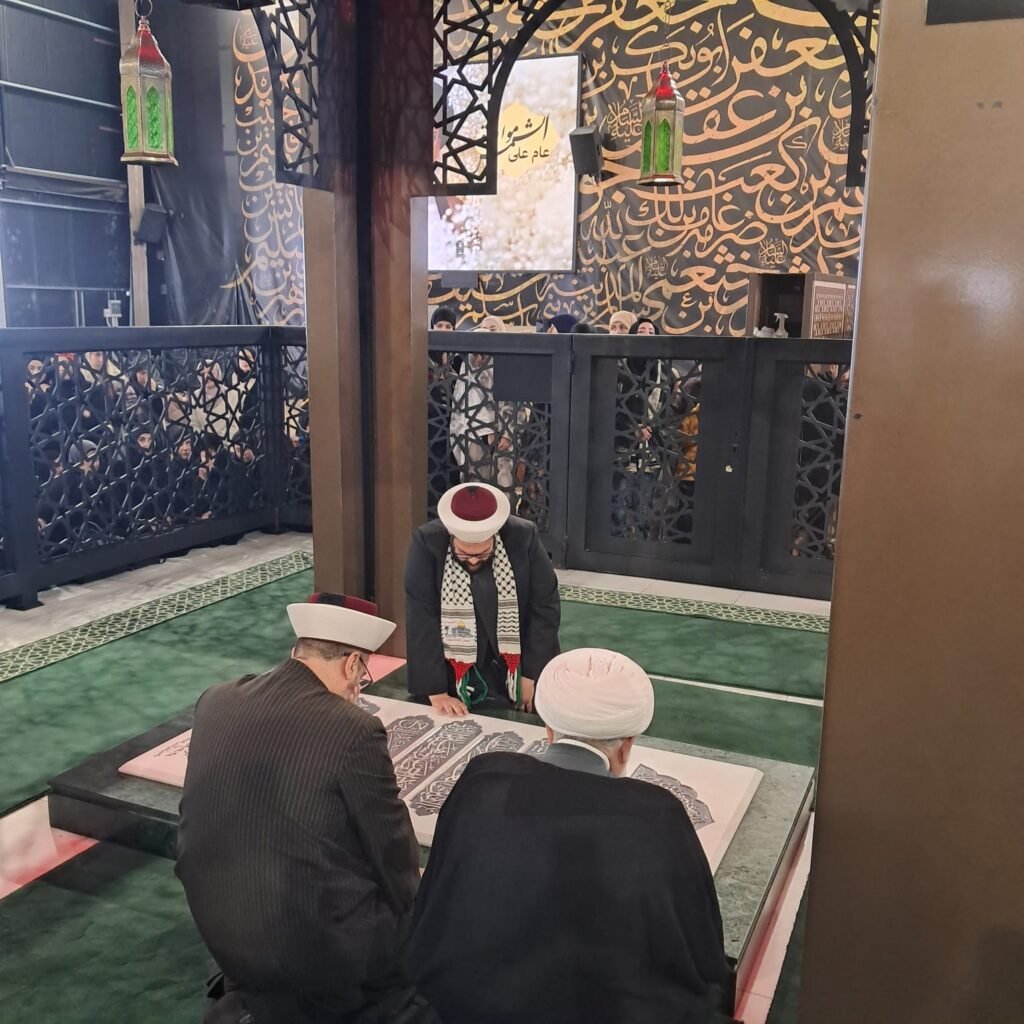 وقد وضعت أكاليل الزهر على الضريح المبارك، وكانت مناسبة لإتاحة الفرصة لوفد تجمع العلماء المسلمين أن يتلو الفاتحة عند الضريح المبارك.