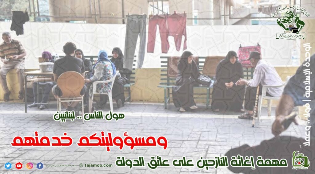 رابعاً: يؤكد تجمع العلماء المسلمين على أن مهمة إغاثة النازحين الذين تجاوز عددهم المليون على عاتق الدولة اللبنانية ولكن ذلك لا يلغي مسؤولية المجتمع الأهلي الذي يقوم عبر بعض الجمعيات الأهلية بواجبه في هذا المجال كما أن علماء التجمع قاموا في أماكن تواجدهم الآمنة باحتضان الآلاف من العائلات النازحة وتقديم الخدمات إليهم.