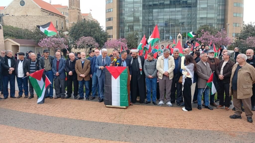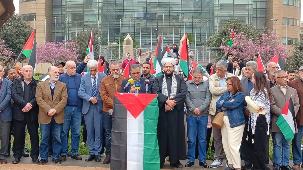 الدعوة التي نظمتها منظمة التحرير الفلسطينية أمام بيت الأمم المتحدة / الأسكوا حيث أكد الحاضرون جميعاً على رفضهم لهذا القرار الاجرامي الموصوف وسلموا نسخة من وثيقة اعتراضية للأسكوا يطالبوها بالتحرك الفوري لوقف مفعول هذا القرار ومحاسبة الكيان على هذا الإجرام الذي يقوم به بحق الأسرى الفلسطينيين في السجون الإسرائيلية.