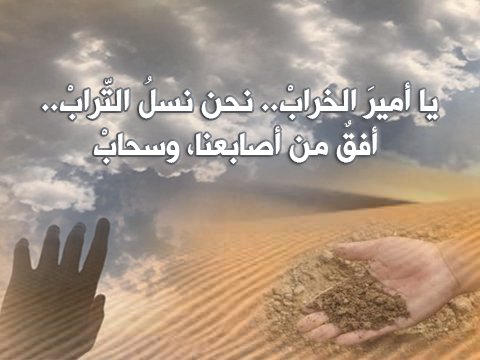 يا أميرَ الخرابْ.. نحن نسلُ التّرابْ.. أفقٌ من أصابعنا، وسحابْ.. في ضمائرنا لا نُسمّى، وفينا دليلُ الكلامْ.. والقصيدةُ ساحرةٌ تتمايل خلفَ نوافذنا سوف نصطادُها.. سوف نقتادُها نحو عشبِ المنامْ.. ونضيءُ لها نارنا ونغنّي لها من غرامِ اللّهيب مقامَ النَّوى ثمّ نسكنُ في ظلِها وننامْ.. بينما سوف تَروي الأنامُ عن قصائدنا سيرةً للهوى.. وتغفو بظلِّ ثريا الانعتاقِ هكذا.. بأمنٍ.. وبسلامْ.